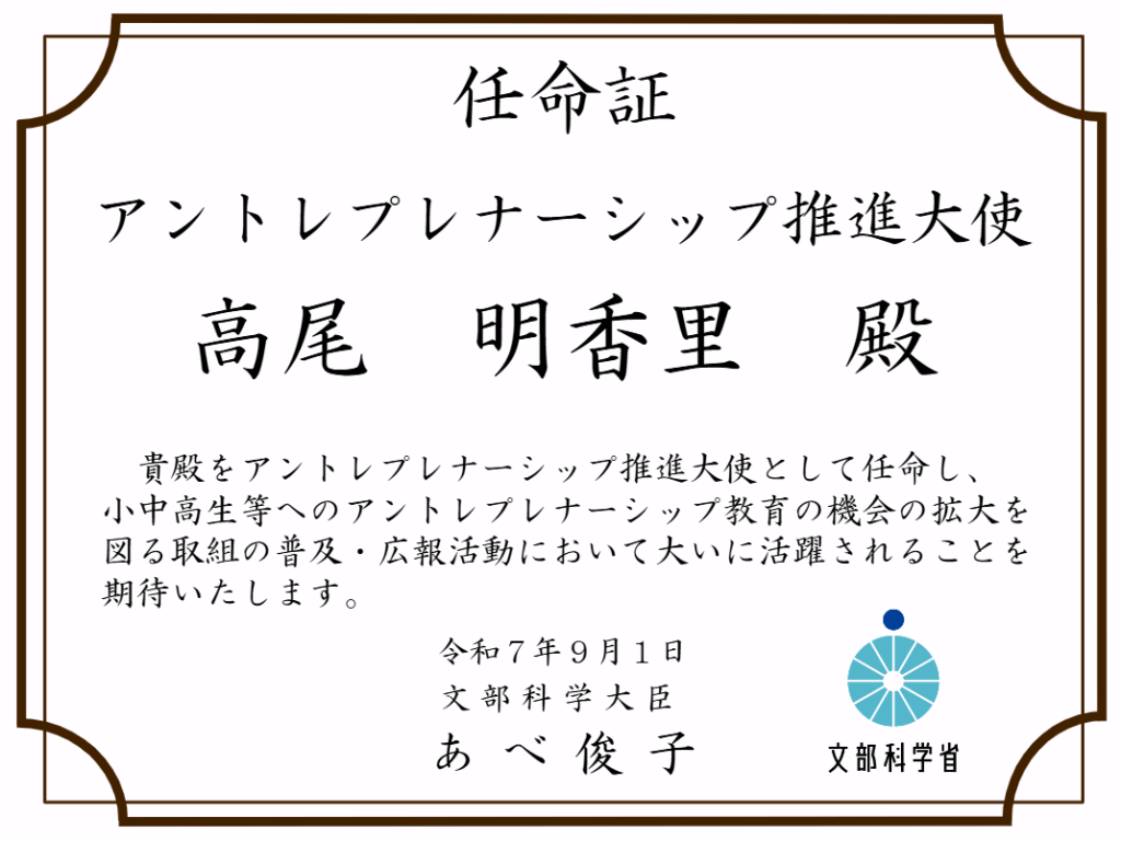 株式会社Japan Fruits 代表取締役 高尾明香里が、文部科学省による「アントレプレナーシップ推進大使」に選出されたことをお知らせいたします。